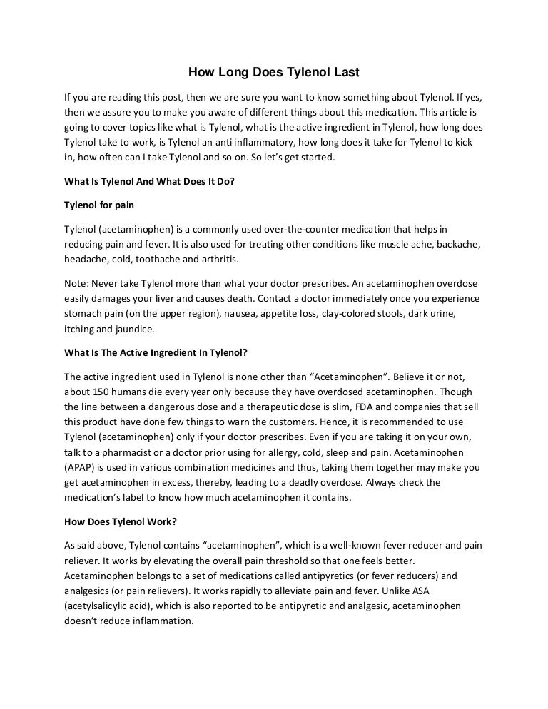 Tablets which disintegrate orally and are absorbed sublingually, start working in 20 minutes. Jul 04, 2018 · according to scientists and doctors, each dose of tylenol extra strength usually lasts from 4 to 6 hours. Multiple studies show that peak concentrations of tylenol in the blood occur within 30 to 60 minutes after taking. See full list on verywellmind.com Please be careful with this drug.