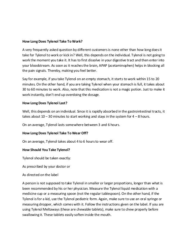 How Long For Tylenol To Work - 30 to 45 minutes intravenous acetaminophen:. But if you take it after meal, it may take 30 to 60 minutes to start being effective. The peak action of the drug is seen between 2 and 4 hrs. Multiple studies show that peak concentrations of tylenol in the blood occur within 30 to 60 minutes after taking. See full list on verywellmind.com If you take more than 4,000 mg per day, you risk irreversible liver damage that ultimately can lead to death.